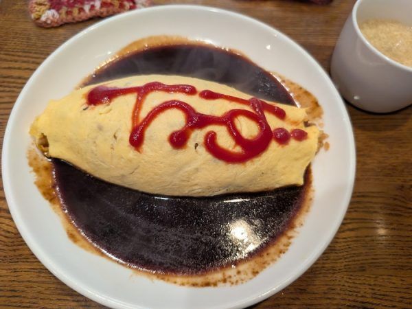 もちろん子供はお目当てのオムライス(950円)を注文。 ソースはデミソース、トマトソース、ケチャップの3種類から選べます。 スタッフさんおすすめのチーズトッピング(100円)を追加。 登場したオムライスの遊び心に思わず笑顔に。
