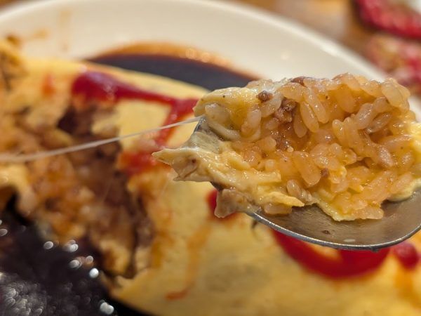 オムライスをスプーンですくうとビヨ~ンとのびるチーズ。 ミンチをたっぷり混ぜて作られたごはんは旨味たっぷり。 マイルドに仕上げられたデミグラスソースはごはんと絡めると最高においしい。