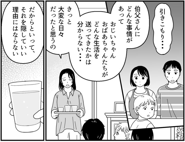私(カナ)は結婚して16年。夫のマサトとユウマ(中1)、レイ(小5)、タクト(小2)と暮らしてきました。そんなある日、義母に大病が見つかります。そして夫に20年以上引きこもっているお兄さんがいることを知らされました。義母は私に入院中の世話や退院後のケアをさせるつもりでいたのです。そうなると私を家に上げざるを得ないから、義兄の存在を明かしてきたのでしょう。私は子どもたちにも一度しっかり事情を話しておこうと決めました。