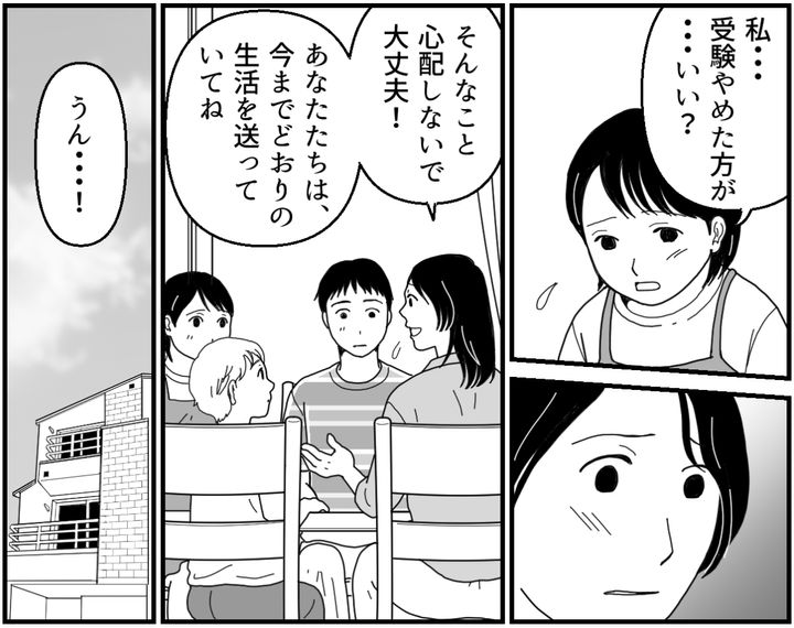レイに聞かれて私は一瞬、言葉に詰まってしまいました。離婚……。よぎらなかったと言えばまったくの嘘になります。ただレイはずっと勉強を頑張ってきました。憧れの熱望校に入るために、並々ならぬ努力をしてきたのです。今ここで不安を煽るようなことになってはいけません。私は子どもたちを励ますように力強く否定しました。