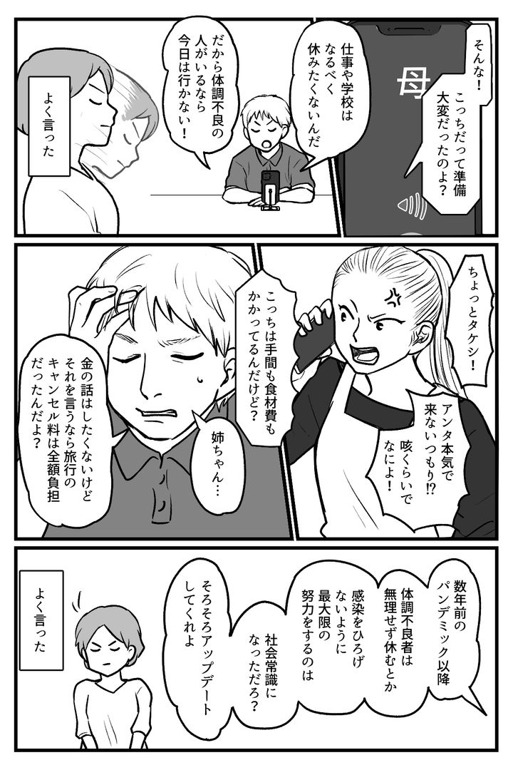 夫は決して行きたくないわけではないことを説明しながら、以前カイリくんの感染症がうつって大変だったことを思い出し、理解してほしいと義姉に訴えました。そして、前回の旅行のキャンセル料を義姉が負担してくれるわけでもなく、子どもたちにうつったとしても責任をとってくれるわけではないことを冷静に話しました。