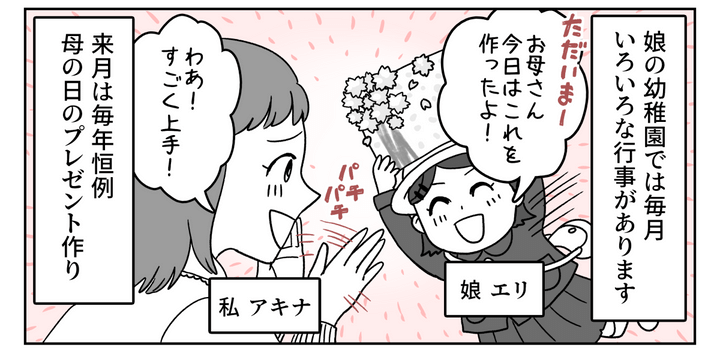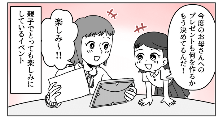 娘もこういったイベントが大好きで、楽しみにしていました。私と娘が一番楽しみにしていたのは、1年に一度ある「お母さんに感謝の気持ちを伝えるイベント」。何日か前からプレゼントを作成して、それを渡してくれるのです。