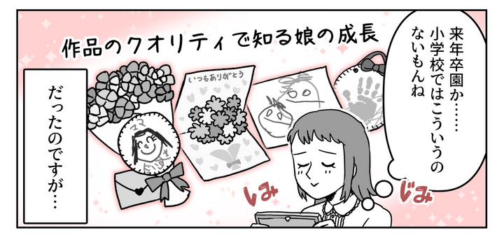 私は娘が作る作品をとても大事にしていました。小さいときから作ってくれたものは大事に飾っていて、毎年見比べて成長を楽しんでいたのです。