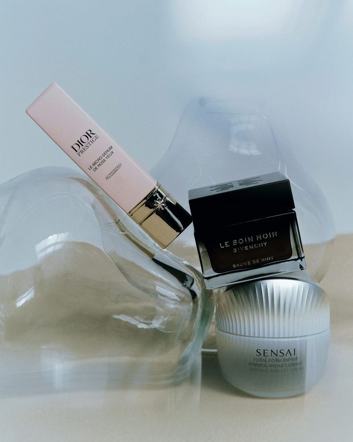 〈上から〉疲れた目もとの肌に不足しがちなカリウムや銅などのミネラルを補い、漂う疲労感を瞬時に解消する。プレステージ マイクロ セラム ユー 20ml ¥30,800 Dior 希少な海の藻の成分が肌でとろけて包み込むようにぴたりと寄り添い、生体リズムをサポート。ソワン ノワール バーム ニュイ 50ml ¥57,200 Givenchy 軽やかながら厚みのあるテクスチャーで新感覚のハリ感を。トータルフォルムエキスパート リンクルアンドリフトクリーム(医薬部外品) 50ml ¥33,000 Sensai
