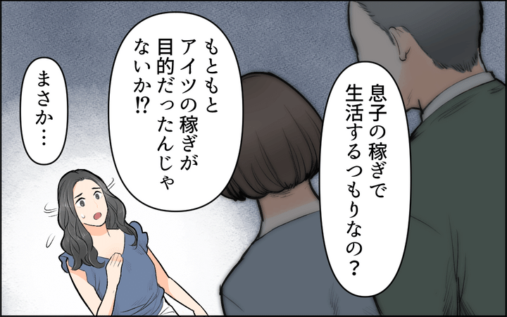 「専業主婦なんて、ただの穀潰しよ」—。主人公のいないところで、平然とそう言い放つ義母。主人公の選択や努力を一切認めず、ただ“息子の稼ぎに寄生する存在”としか見ていなかったのです。あまりにも残酷な本音。夫は、この義父母から、妻である自分を守ってくれるのでしょうか…。
