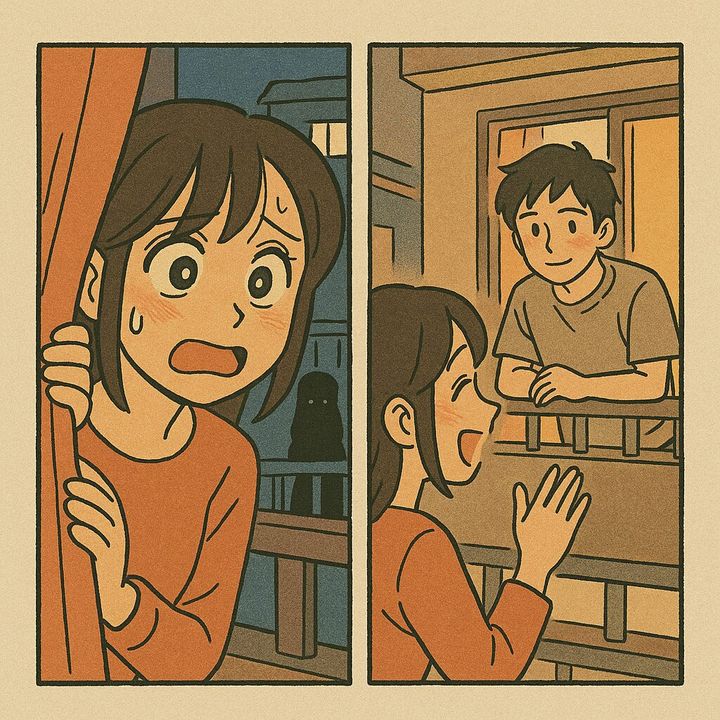 「すみません…怖がらせるつもりはなかったんです。カーテンを開けて、窓際の明るい場所でカットの練習をしていただけなんです。」とベランダ越しに謝る彼に、私は拍子抜けしてしまいました。