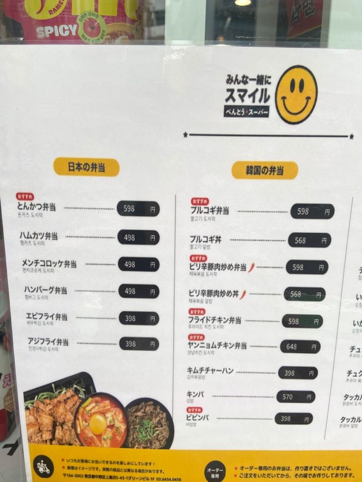 先日、西武新宿線新井薬師前駅周辺を散策していたら、メニューの種類豊富・安くて美味しいお弁当や韓国食品を販売しているお店を発見したので訪問してみました。西武新宿線新井薬師前徒歩1分の所にある【SMILE】さんです。