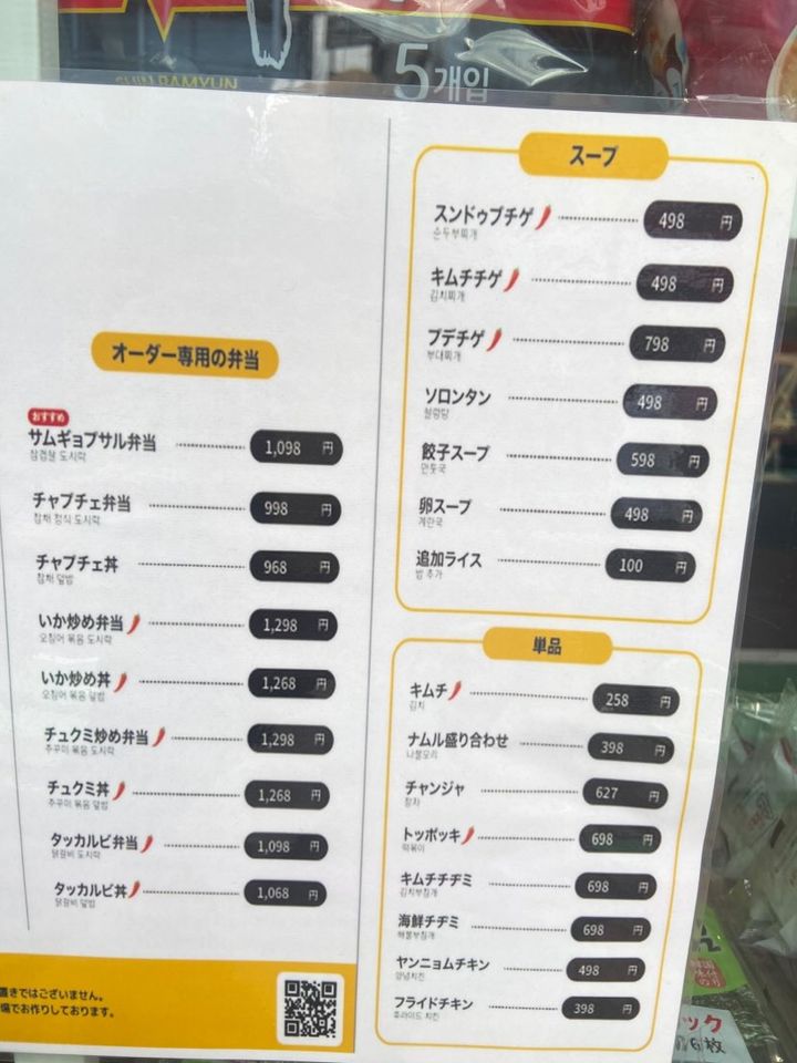 店内に1歩入ると韓国のお菓子・ラーメン・海苔などがずらっと並んでいました。隣には厨房がありました。メニューの種類がとても豊富で、とんかつ弁当・エビフライ弁当・アジフライ弁当等の日本の弁当、プルコギ弁当・フライドチキン弁当・ヤンニョム弁当等の韓国の弁当、キムチ・キンパ・チヂミ・トッポッキ・キムチチゲ等の韓国料理の単品などを注文することができます。単品料理は、258円〜・弁当は、398円〜本場韓国出身のオムニが作る料理をいただくことができます。お持ち帰りのみです。