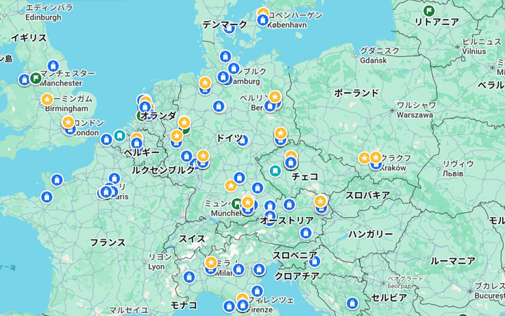 そして、こちらが私がピンを立てまくったGoogleマップです。ヨーロッパだけでこんなにも。