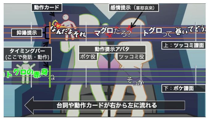 このシステムの特徴は、2人組(ボケ役・ツッコミ役)がそれぞれの役割を分担し、画面に表示される台詞や抑揚、感情表現、動作の指示に従うだけで、本物さながらの漫才を演じられるという点です。