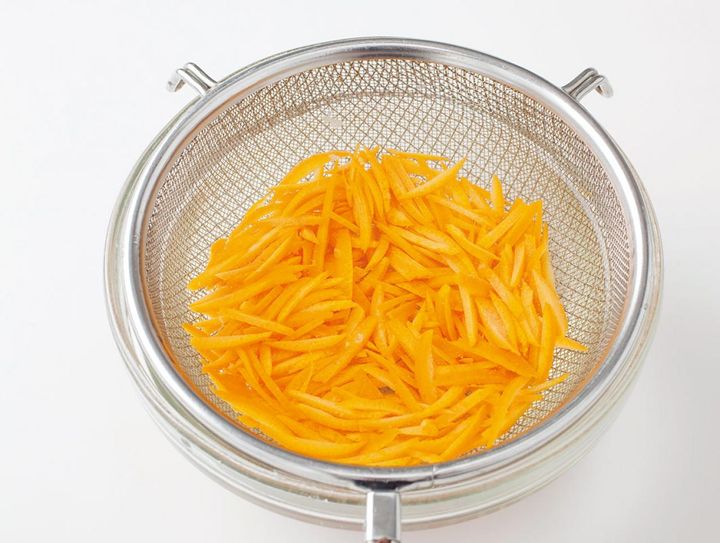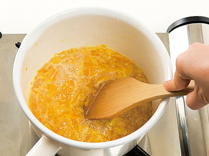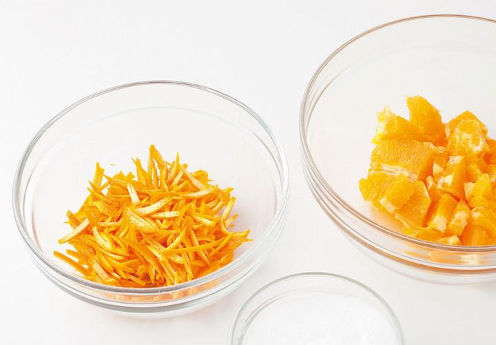 ①オレンジはぬるま湯でよく洗い、水洗いして水けをふく。皮を厚くむき、内側の白い部分をスプーンなどでていねいにとり除き、細切りにする。果肉は種をとって房ごとざく切りにする。果肉も使うとフルーティーでとろみもつく。
