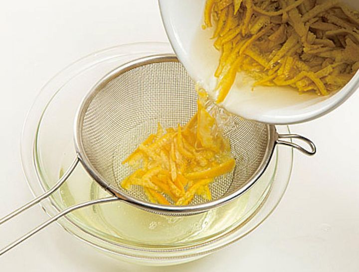 ②鍋に皮を入れ、たっぷりの水を加えて火にかけ、3回ほどゆでこぼす。ゆでこぼすことで、アクやくせがなくなる。