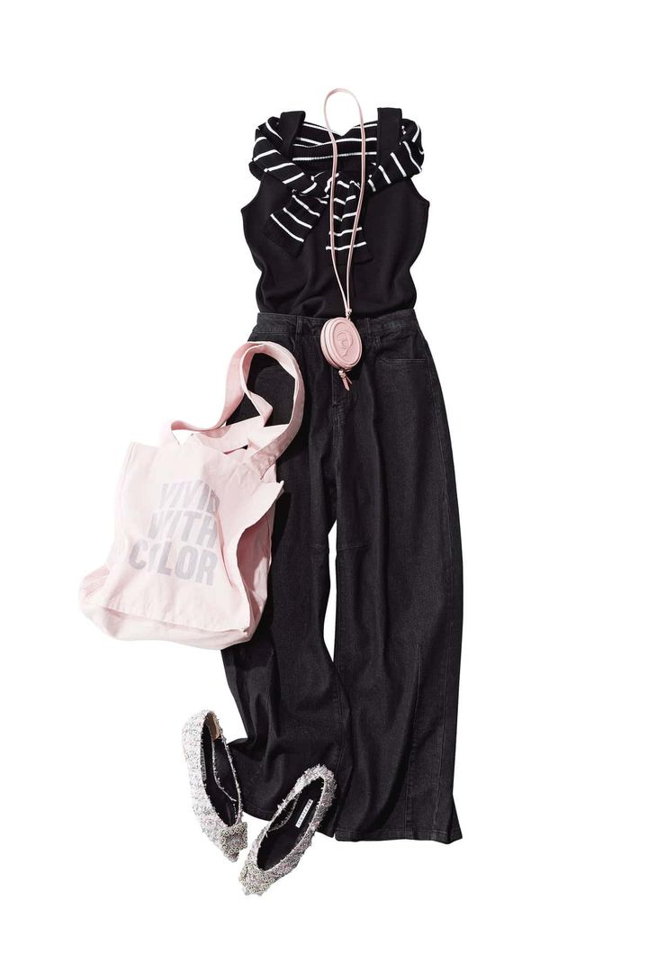 ともすると地味になりがちな黒タンク×黒デニムには、ボーダーニットを肩掛けしてコーデにアクセントをプラス。シンプルな黒ベースに柄アイテムをひとさじ加えるだけで、一気にこなれ感が生まれます。さらにピンクのバッグや小物をリンクさせれば、カジュアルながらも華やぎのある着こなしに。