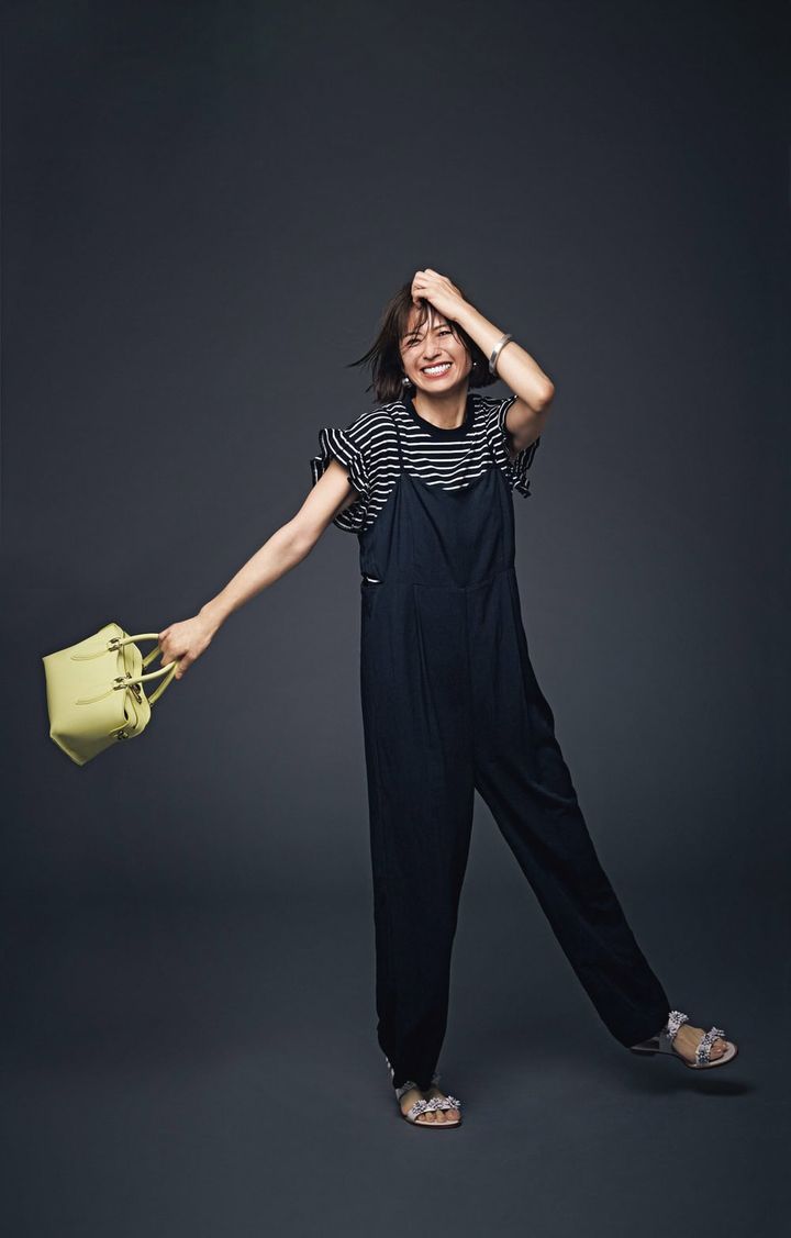 サロペット¥8,800(オペーク ドット クリップ)フリルボーダーカットソー¥3,630(フリークス ストア/フリークス ストア渋谷)バッグ¥49,500(トフ&ロードストーン)サンダル¥31,900(ツル バイ マリコ オイカワ)ピアス¥4,400(AKTE)バングル¥4,320(アビステ)