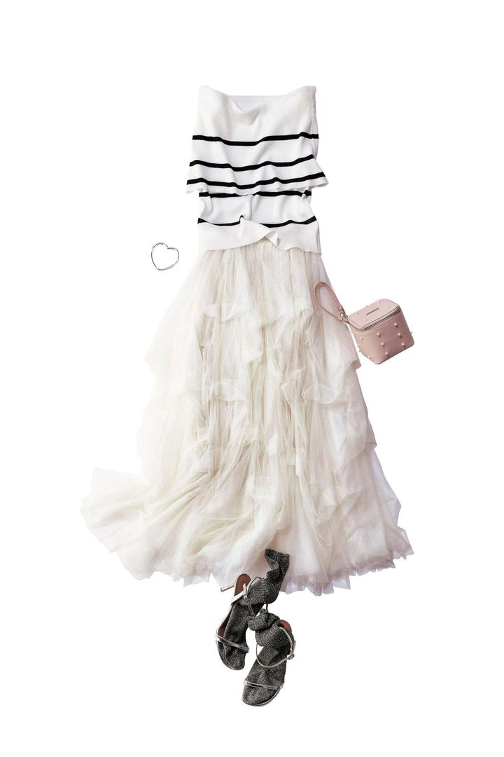 ともすると甘くなりすぎてしまう白のオフショルもランダムなボーダーでヘルシーに。ホワイトコーデも程よく引き締めてくれます◎。