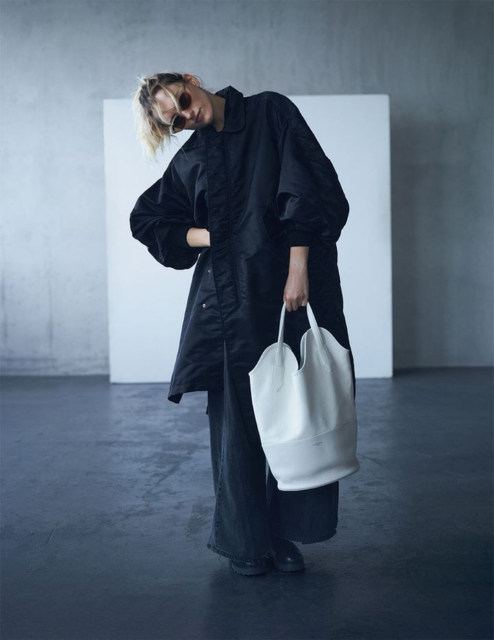 【POINT】黒にいっそうの迫力をもたらす長め丈でブルゾンをモードに転換。黒デニムもアウターの迫力に負けない幅広ワイドでとことんハンサムに。