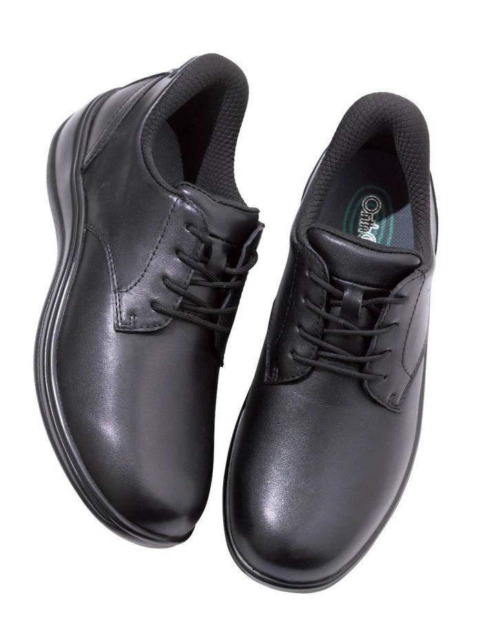 甲の厚みに合わせて紐を調整でき、きちんと見えて疲れにくい。立ったまま脱ぎ履きもできる。