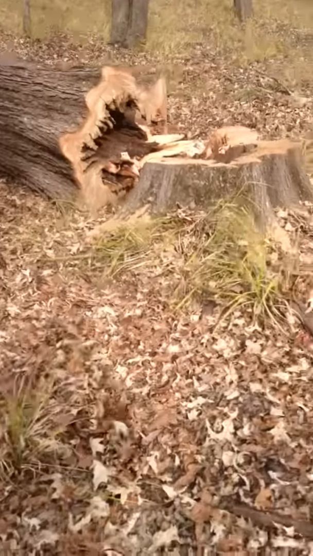 チェーンソーを使って太い木を伐採する男性。 ついに木が倒れた!と思ったら・・なんと幹の中から犬が姿をあらわしました!!