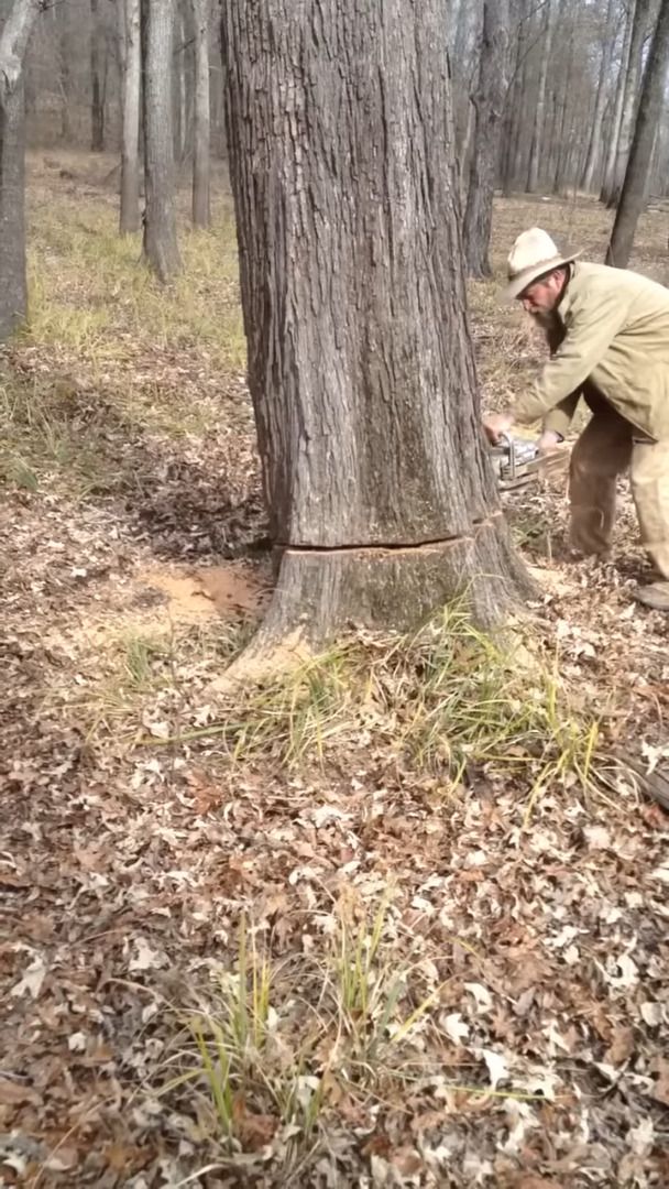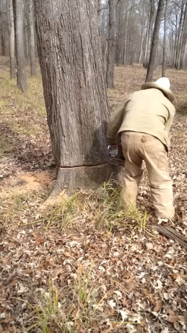 チェーンソーを使って太い木を伐採しようとしている男性の姿が映し出されます。