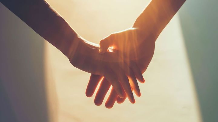 Two hands try to touch each other. Communication concept. Light colors with shadows. Aesthetic background. Generative AI