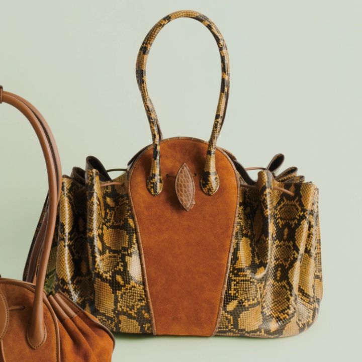 ソフトなスエードとしなやかなパイソンプリントレザーを使用したラージバッグ。ヴィンテージなムード漂うヘビ柄がアクセント。
