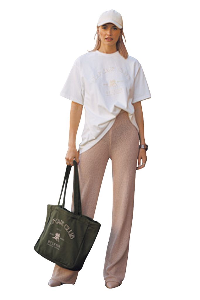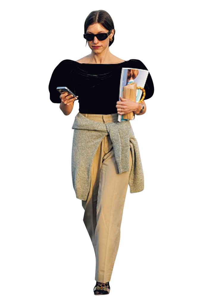 オフィスライクな美脚パンツをカジュアルにも活用。ゆるいTシャツはタックインしてくびれをきわ立たせ、間のびをカット。甘いパフスリーブは腰巻きで適当感を演出しつつ、ベルト部分をしっかり見せれば、丁寧なラフスタイルが完成。