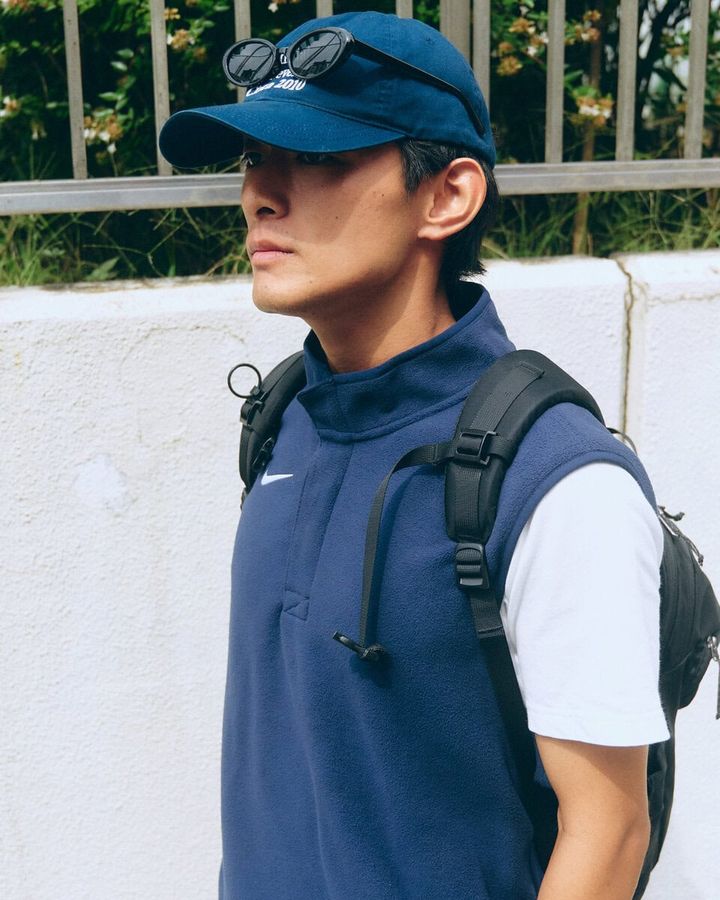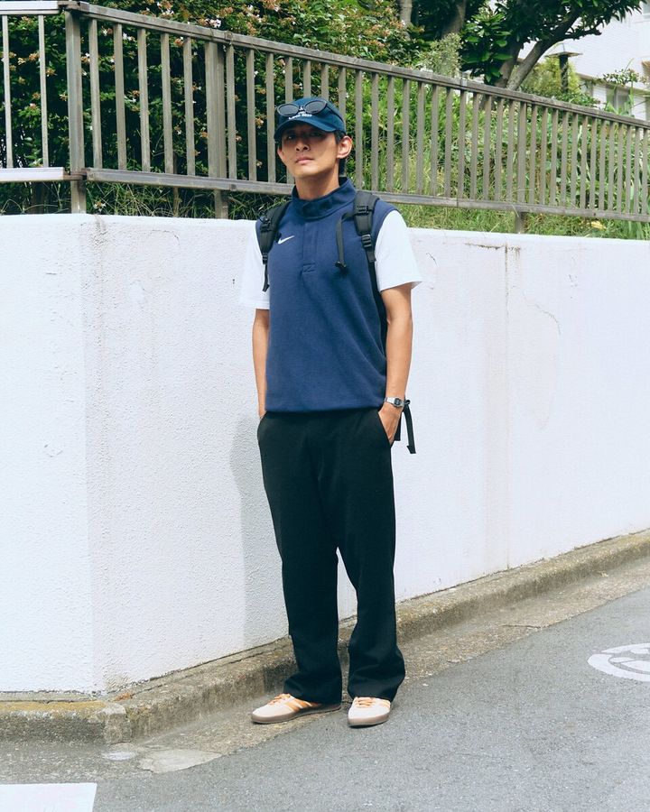 【スナップ】Tシャツ×フリースベストのレイヤリングが秋晴れの日にちょうどよい季節感