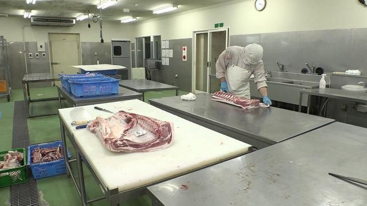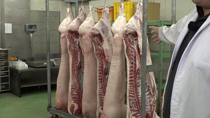 2日前に出荷されて食肉センターで加工された後の解体された6頭のブタたちが、お肉になって目の前に。