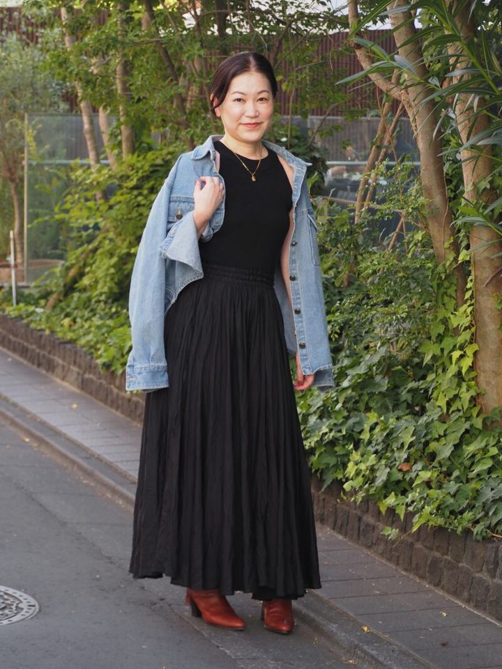 黒をベースにしたシックな装いに、デニムジャケットをオン。さらっと肩掛けすることで抜け感が増し、きれいめとカジュアルがバランスよく両立。一枚でコーディネートが完成する「ハーリップトゥ」のワンピースは異素材の切り替えがポイント。上半身はリブのアメスリタンクのデザインで、ボリューム感のあるシフォンスカートとの相性が抜群。自然とスタイルアップが叶うアイテムなのだとか。