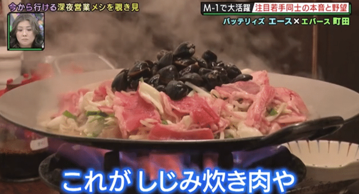 「やすとものいたって真剣です」が放送されている深夜0時ごろにもまだ開いているお店で、芸人がサシ飲みを楽しむ「深夜営業メシ」。今回は、昨年の「M-1グランプリ」で準優勝し、東京進出するやいなや、おバカキャラで大ブレイクしたバッテリィズのエースが、同じく「M-1グランプリ」を機に人気者となったエバースの町田を地元・大阪の馴染みの店に案内! 関西芸人御用達の“しじみ炊き肉”の名店で、互いに仕事が急増した“今”の思いを語り合う。
