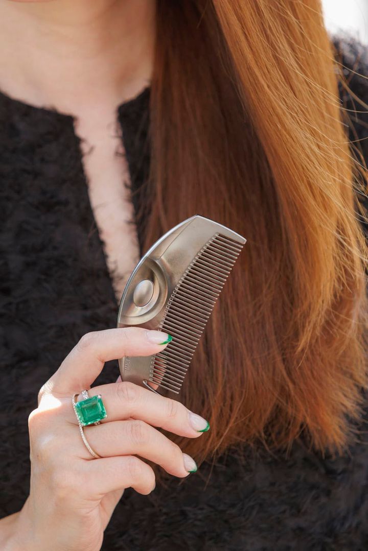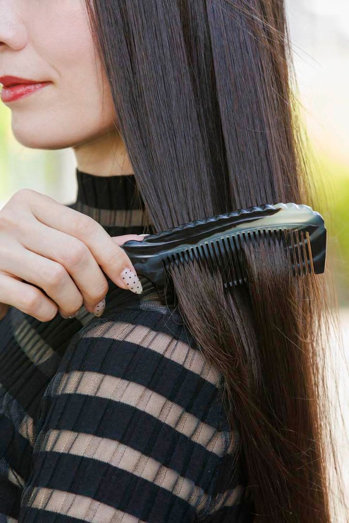 産後一旦ボブにしましたが、それ以来15年間ずっとロング派。元々ヘアアレンジが好きなので、まとめ髪やウェーブヘアなど、自分のその時の好みに合わせてアレンジできるので安定的にロングが好きです。ヘアオイルはlekarkaを愛用。ドクターズコスメから出ているヘアケアラインで、ヒト臍帯幹細胞順化培養液配合で頭皮マッサージをして養毛効果もあり、ドライヤー前後に付けるとサラサラに。ラブクロムのコームはコンパクトで持ち歩きやすく、摩擦を防いでくれるのがポイントです。