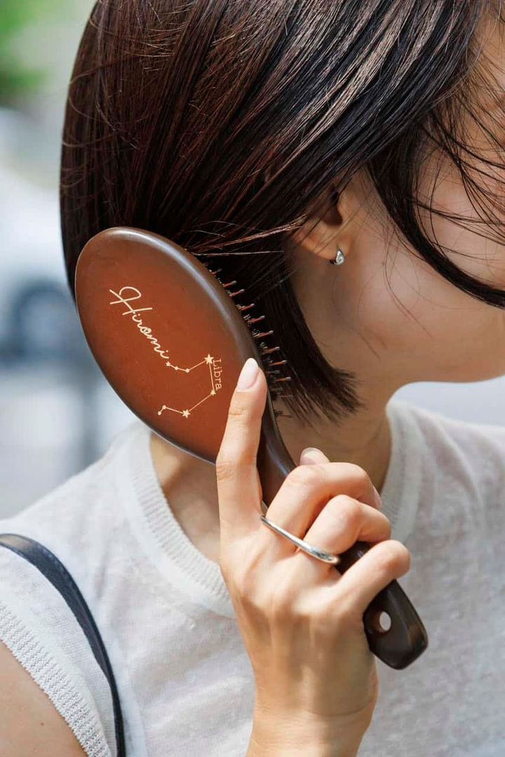 ミニボブをモードに仕上げるのに欠かせないのがツヤとウェットな質感で、スタイリングにはバームとオイルを混ぜて使っています。O by FのリッチスタイルバームとRiri mimi オーガニックケアオイルはストックが切れると不安になるほど信頼を置いています。普段のケアにはアウトバストリートメントでgiovanniの2chicモイスト ヘアセラムを愛用。ベタつかずサラサラになるので気に入っています。ジョンマスターオーガニックのブラシは優しい使い心地で頭皮に刺激が少ないのと、サラサラになるのでお気に入り。自分の星座が入っているのも特別感があって嬉しいです。