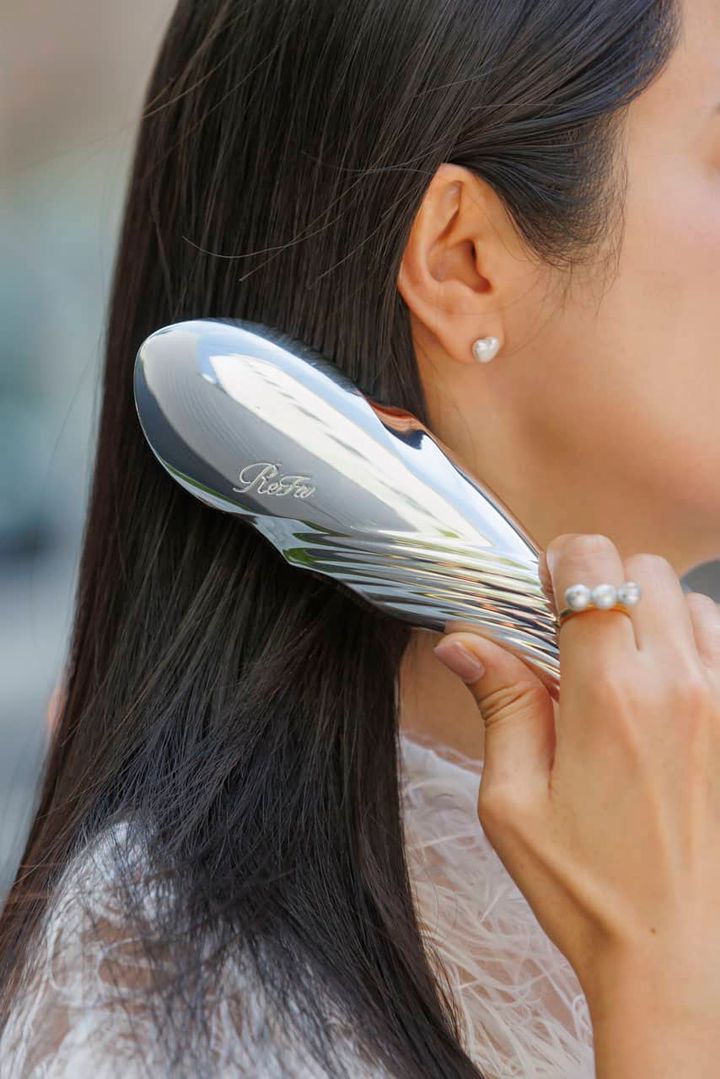 ここ数年でファッションの好みに変化があり、メンズっぽいコーデやモードなスタイルが好きなので、髪型は女っぽさをプラスしたくてロングヘアに。以来、ロング歴3年。健康的でツヤのある黒髪と褒めてもらえるのも嬉しいです。カットとは別で、ヘッドスパはmember’s 58. に。美髪のためには頭皮ケアがマスト!スタイリング剤はCOTA COUTURE A-LINEを愛用していて、洗い上がりのドライヤー前や乾いた髪に使用。Refaのブラシはサロンのスタッフからもらって以来嬉しくて愛用しています。