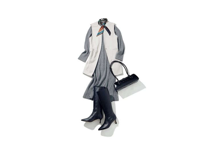 ビスチェ付きニットワンピース(ワンピース)¥3,990/GU ジレ¥19,000/PLST ロングブーツ¥42,350/ダイアナ(ダイアナ 銀座本店) 横長バッグ¥17,380/Cepika(ジオン商事) スカーフ¥16,500/マニプリ