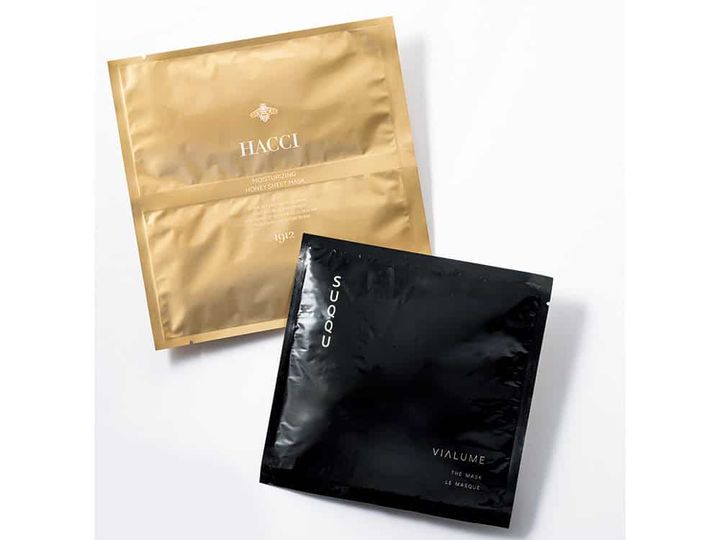 左から・シートマスク 6枚入り ¥14,300/HACCI、ヴィアルム ザ マスク 5枚入り ¥13,200/SUQQU