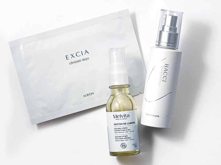 左から・エクシア クリニシャス デイズ 19㎖×28枚 ¥22,000/アルビオン、ネクターデルミエール アクティベーターオイルウォーター 50㎖ ¥5,390/メルヴィータ、発酵液ミルク 80㎖ ¥8,580/HACCI