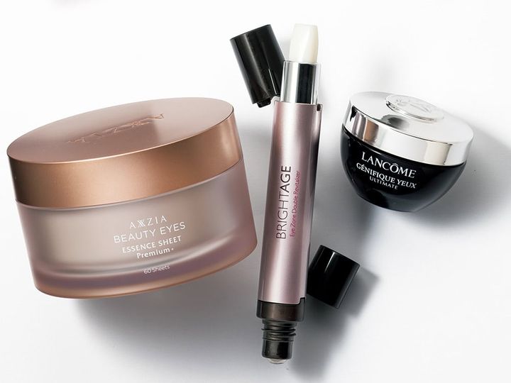 左から・アクシージア ビューティーアイズ エッセンスシート プレミアム プラス 60枚入り ¥9,900/アクシージア、アイゾーン ダブルリバイタライザー ¥7,150/第一三共ヘルスケアダイレクト、ジェニフィック アルティメ アイクリーム 20㎖ ¥11,000/ランコム