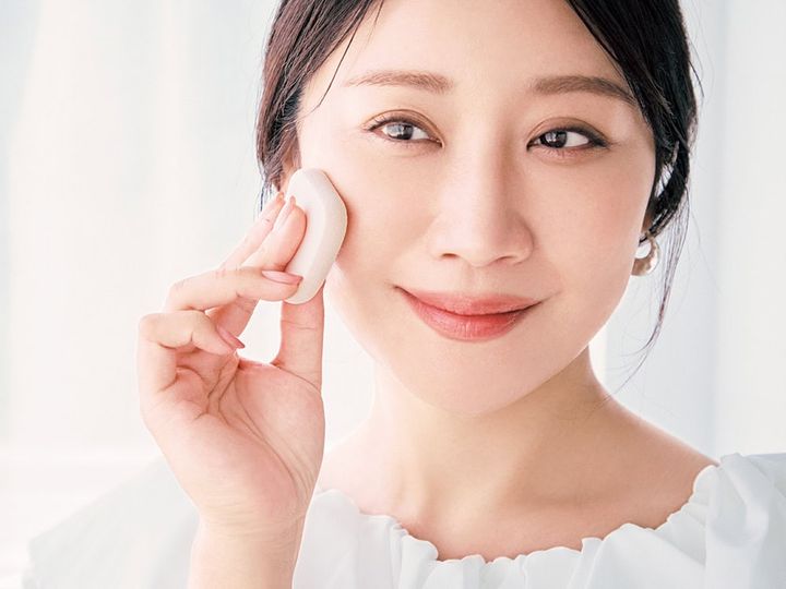 スキンケア効果の高いエマルジョンファンデを重ねて。朝はもちろん、乾燥を感じる日中のファンデの塗り直しもトリートメント効果の高いものを選んで。