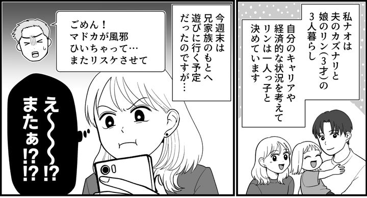 今週末は、わが家から車で1時間弱の街に住む兄の家に遊びに行く予定だったのですが「ごめん。マドカが風邪ひいちゃって。またリスケさせて」と兄から連絡がきたのです。兄から約束をドタキャンされるのは、これで何度目でしょうか。いい加減にしてほしいです。