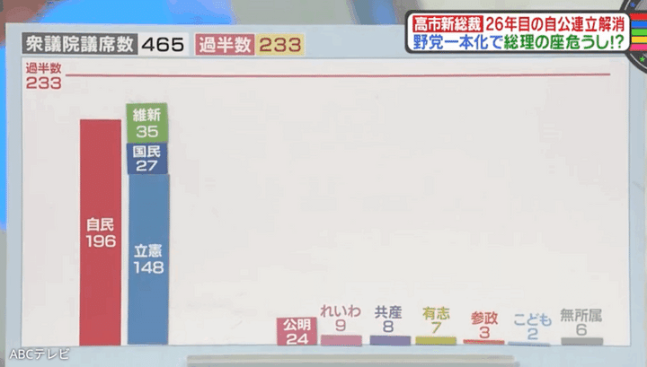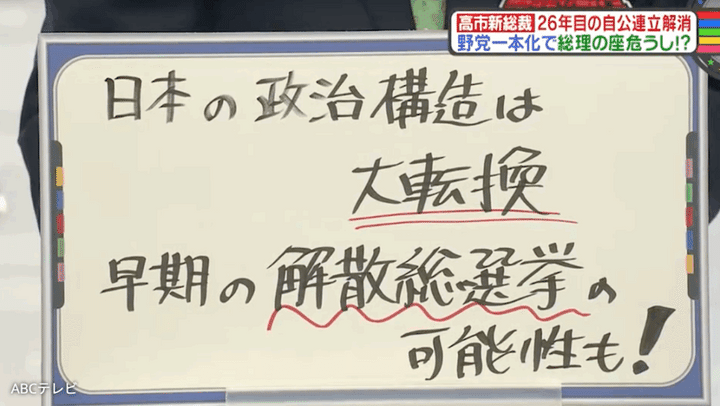 このまま総理指名選挙で女性初の総理に!? と思われた矢先、自民党は連立政権を26年間共に担ってきた公明党から三行半が突き付けられた!! これを受けて、自民党は臨時国会召集を見送る方向だ。そして、立憲民主、国民、日本維新が野党統一候補を擁立すれば、高市“総理”は誕生しない可能性も出てきた。