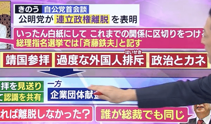 そして、公明党は高市新総裁への懸念として「靖国参拝」「過度な外国人排斥」「政治とカネ」を挙げている。自民党も、公明党に譲歩する表明をしたものの「企業団体献金」についての溝は埋まらなかった。
