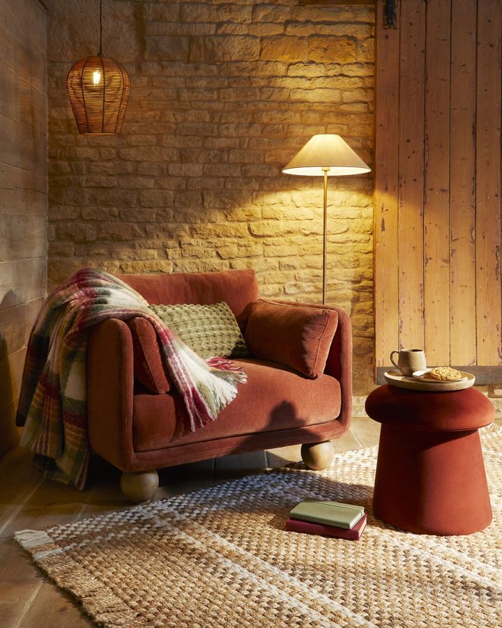 居心地のいい家作りは、色から始まります。個人的に好きな色でも、それ自体に温かみのある色でもいいので、自分が寛げる色合いを選びましょう。「キャラメルカラーやアーシーな茶色、バーントオレンジのように、リッチで濃い色合いを恐れないで」と語るのは、インテリアショップ Swyftでクリエイティブ部門の部長を努めるケリー・コリンズさん。