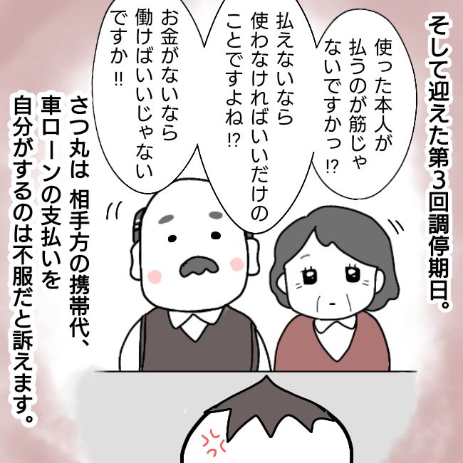 電話で話しても「離婚前なのだから旦那が払うのが当たり前」という反応…。納得のいかないさつ丸は、第3回調停でそのことを不服だと訴えました。