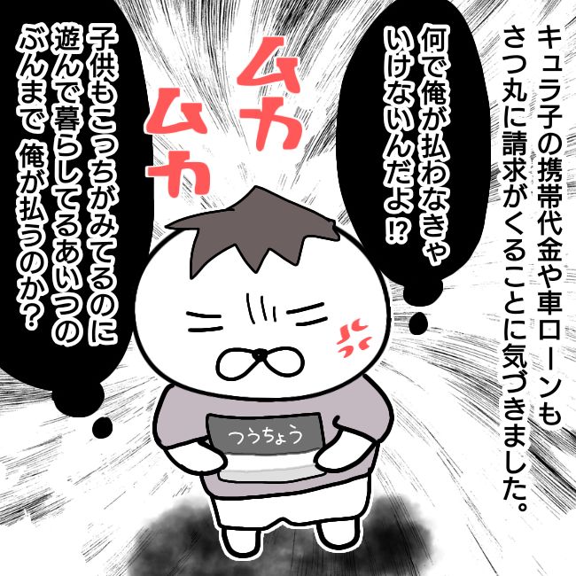 キュラ子は子どもの給食費や学校に支払うお金も納めなかったにも関わらず、自分の携帯代や車のローンはさつ丸に請求がきます。