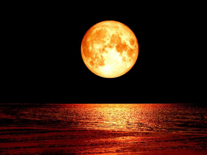 super full blood moon on the sea and night sky backgroud