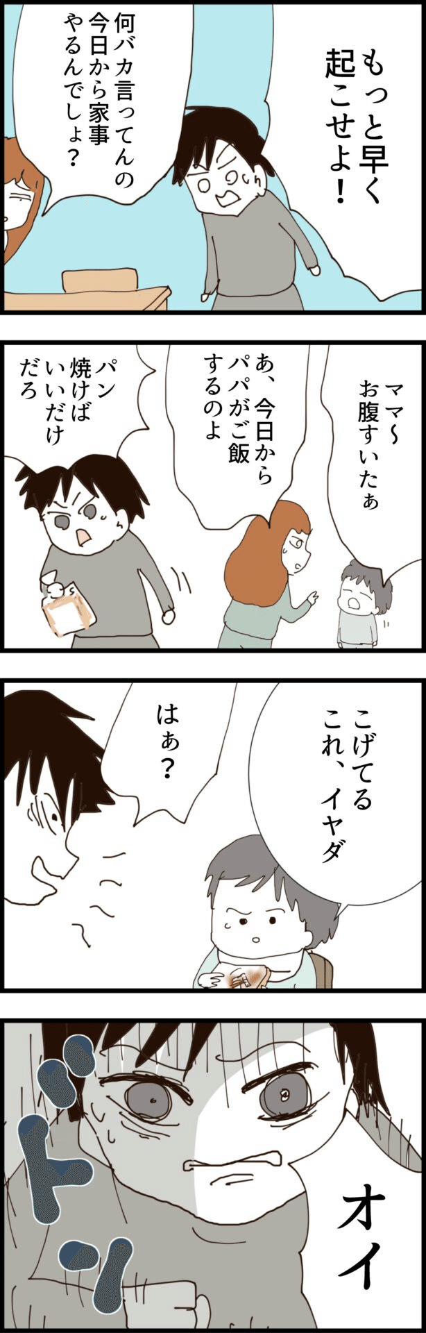 気を取り直して夫を起こしますが、まさかの逆ギレ! 夫は大慌てでパンを焼きますが、それすらもうまくいかなかったようです…。前途多難ですね…。