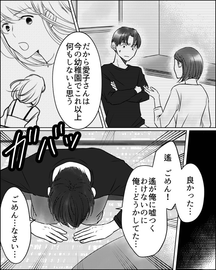 すでに夫の誤解は解けており、実家に迎えに来た夫は、私の両親にも直謝りしていました。そして今回のいきさつと、ママ友が明かした件について私の推量を伝えました。