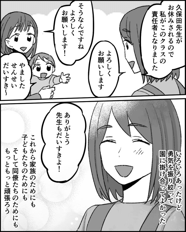 久保田先生の非を公にするのに、私としても勇気が必要でしたが、結果よかったと思っています。これから心機一転、園の子どもたち・同僚たちと園での生活を過ごしていきたいです。