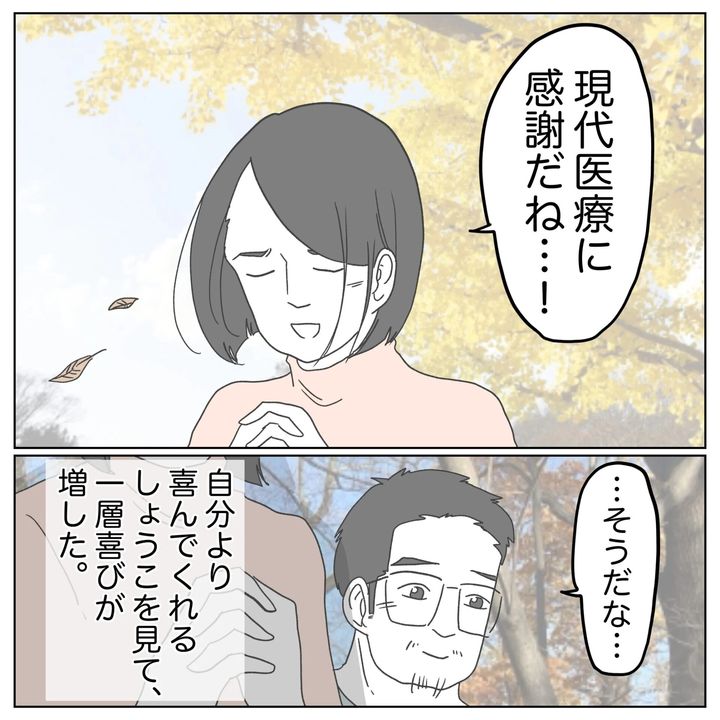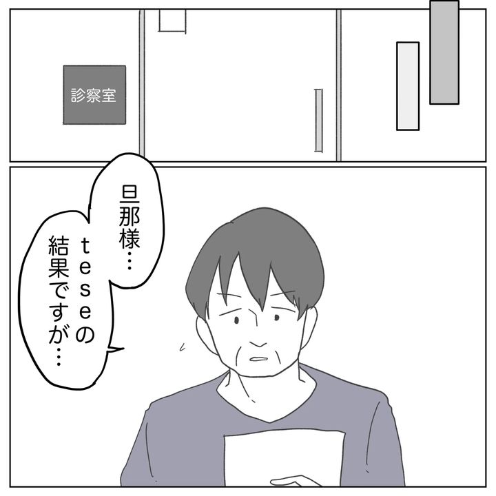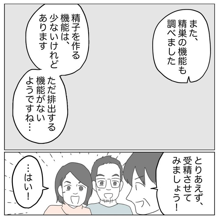 結果にあまり期待をしていなかった夫だが、医師から「12個ほど採取できた」と聞き、嬉しくなる。精巣の機能についても調べてくれて、精子を作る機能は少ないけどある。しかし排出する機能がないと聞かされるのだった。