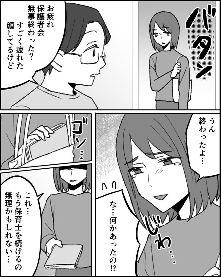 いてもいなくても変わらない保護者会を終え家に帰ると、思わず涙が溢れてしまいました。もうこのまま保育士は続けられないかもしれない…私は夫に事の次第を話しました。